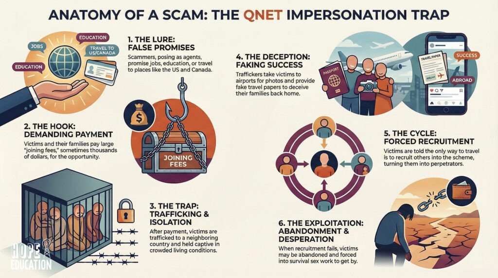 These victims were lured under the pretext of job, educational, and travel opportunities. However, upon arrival, they were told those agreements “didn’t exist anymore” and were forced to engage in QNet business instead.